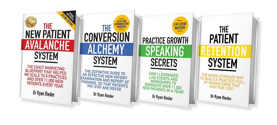 Access Dr. Ryan Rieder’s best-selling books and world-class live events — all designed to help chiropractors attract more patients, improve conversions, and scale smarter. From marketing and communication to retention and leadership, these resources give you the tools and confidence to build a thriving, seven-figure practice.